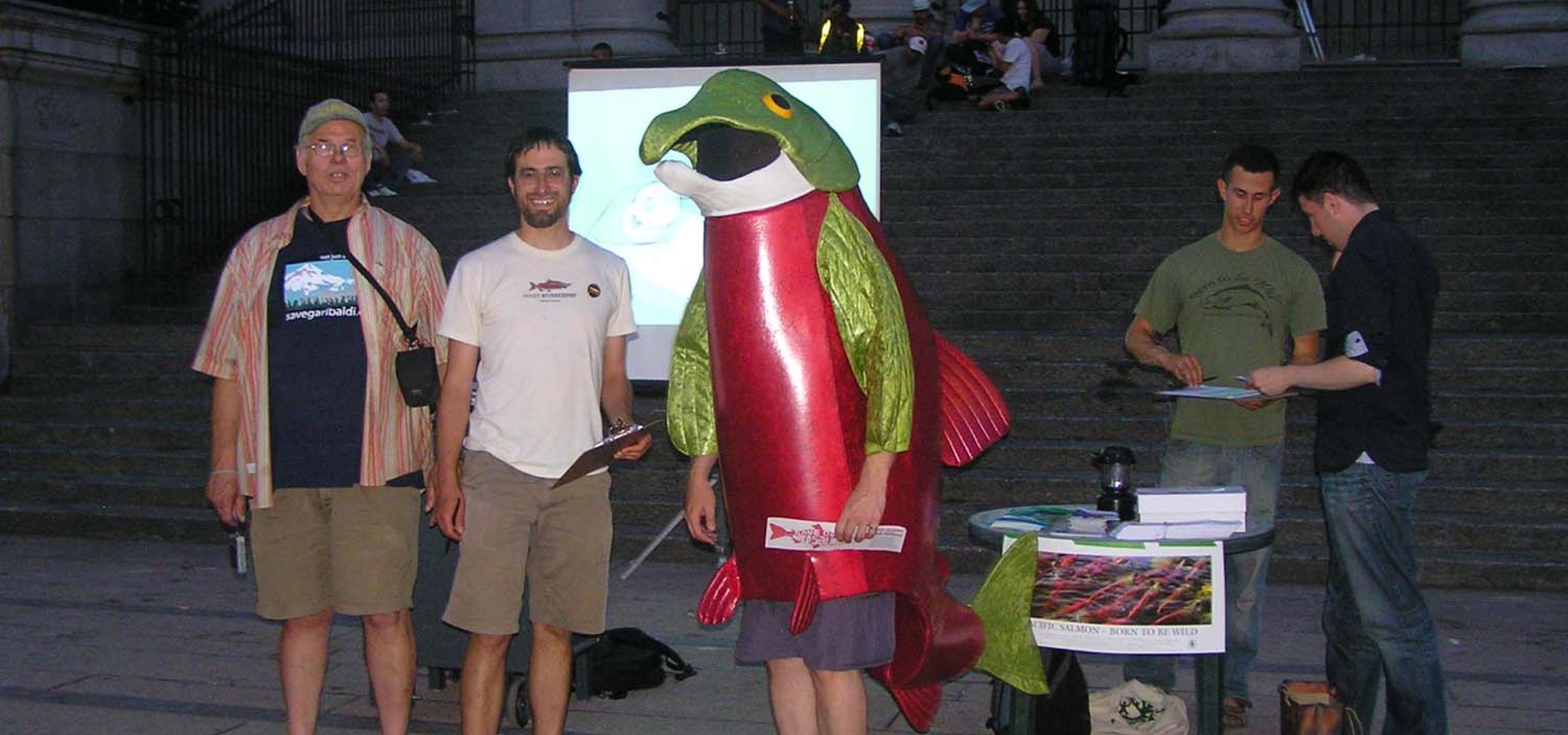 Last Friday night, July 17th, "Tum Tum - Voice of Wild Salmon" mascot was joined by several wild salmon defenders: Ana Santos and Jack Cooley of Wild Salmon Action Circle from Squamish, and Graham Girard, Rick Glumac and Geoff Senichenko from the Wilderness Committee. Under Graham's leadership, we set up a mobile video station in front of the Vancouver Art Gallery steps on Robson Street in downtown Vancouver where we showed Watershed Watch's new salmon farming short animation video for people passing by to see and learn about how salmon farming sea lice and practices are harming wild salmon. The group also handed out literature, had people sign action cards and petitions. All in all it was a great success in reaching out to people unaware of the issues with salmon farming. Everyone loved Tum Tum too! Looking forward to our next outreach event.