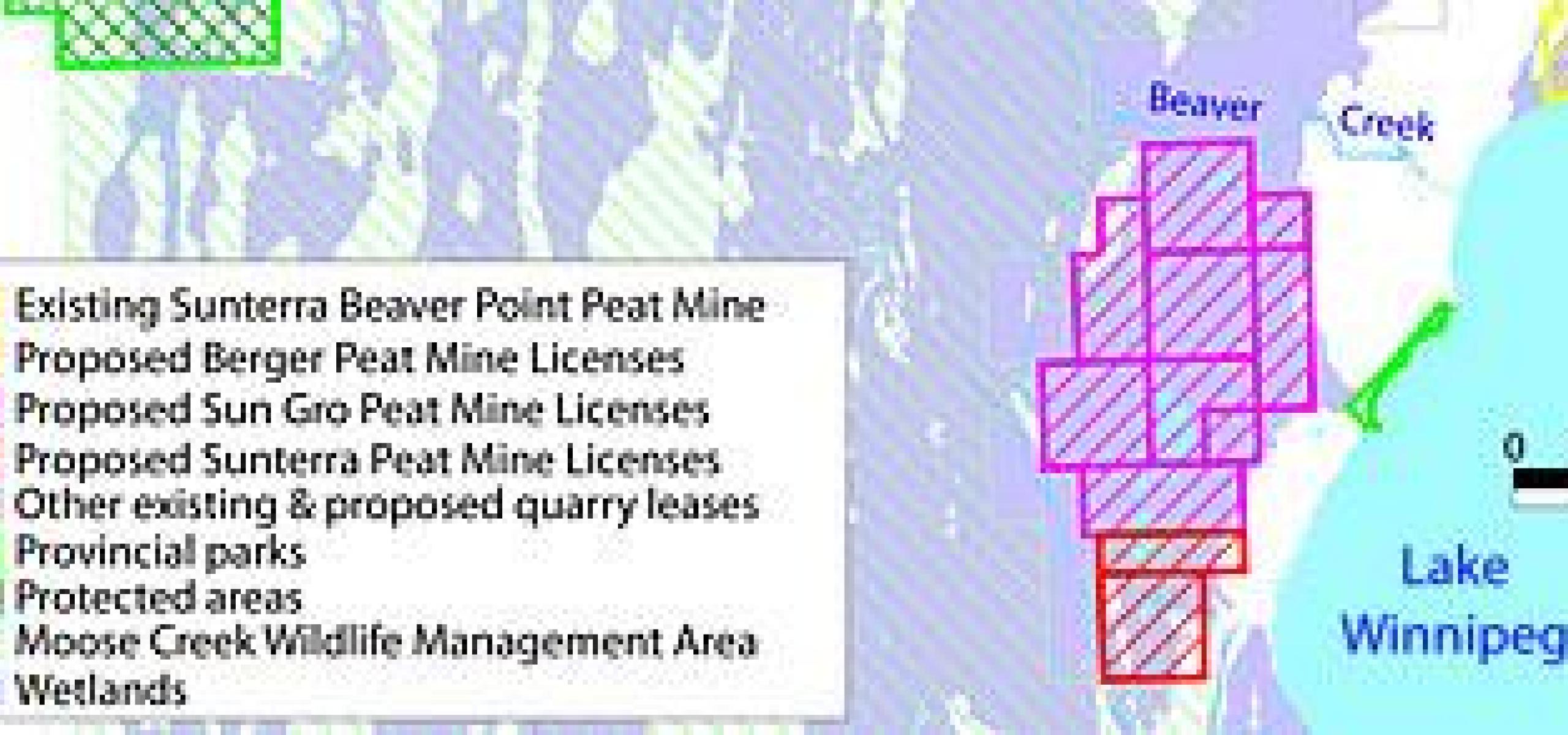 Sunterra is proposing to mine three separate peat bogs on the Washow - Fisher Peninsula, north of Riverton and Gimli. Sun Gro Horticulture and Berger Peat were recently given licenses to open large new mines in this same area. While the individual mining operations will be harmful in their own right, the cumulative impact of so many mines in one area will be exponential.