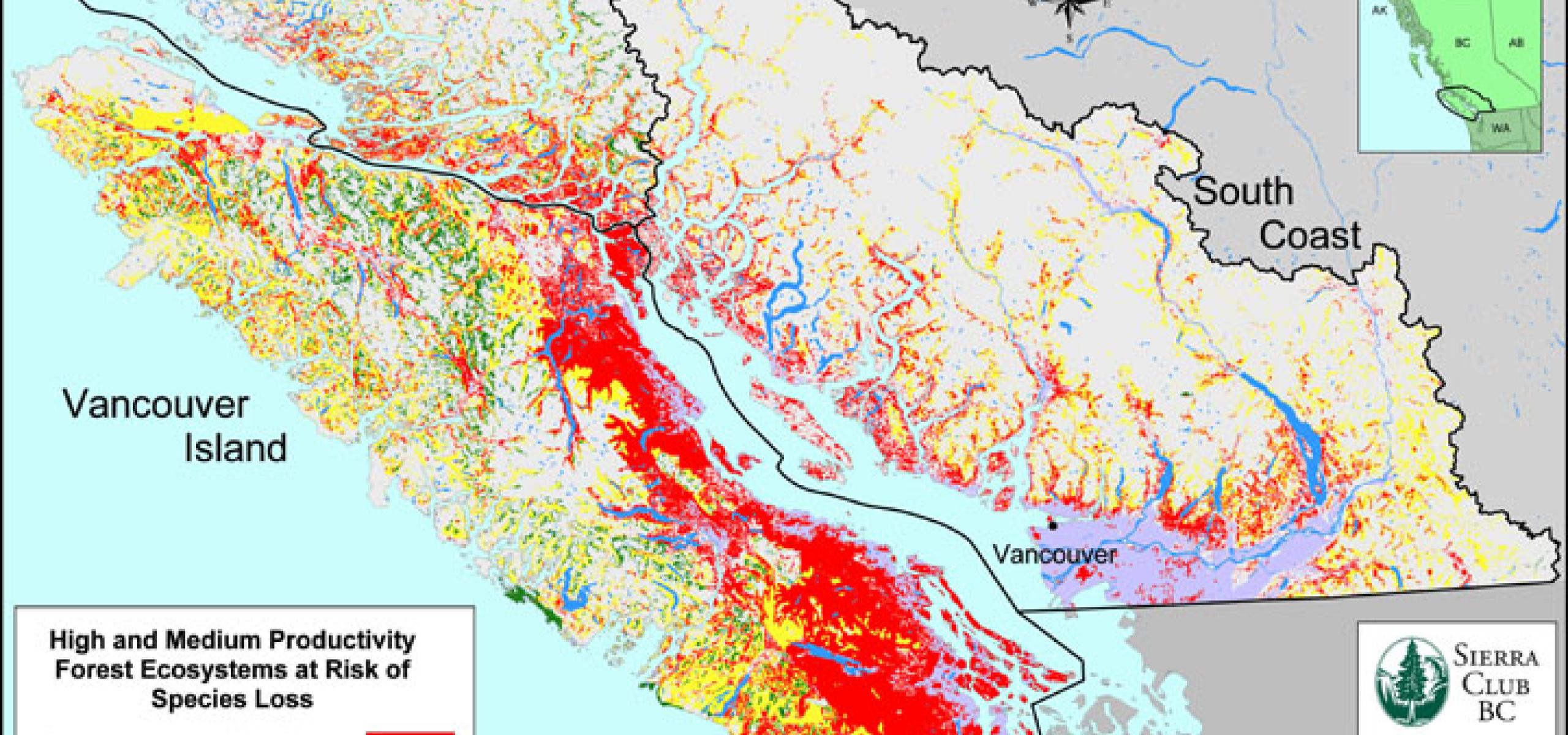 VICTORIA, BC – Decades of old growth logging have left an alarming 50 percent of all forest ecosystems on Vancouver Island and the South Coast at a high risk for species extinction and loss of carbon storage, according to a new Sierra Club BC report.