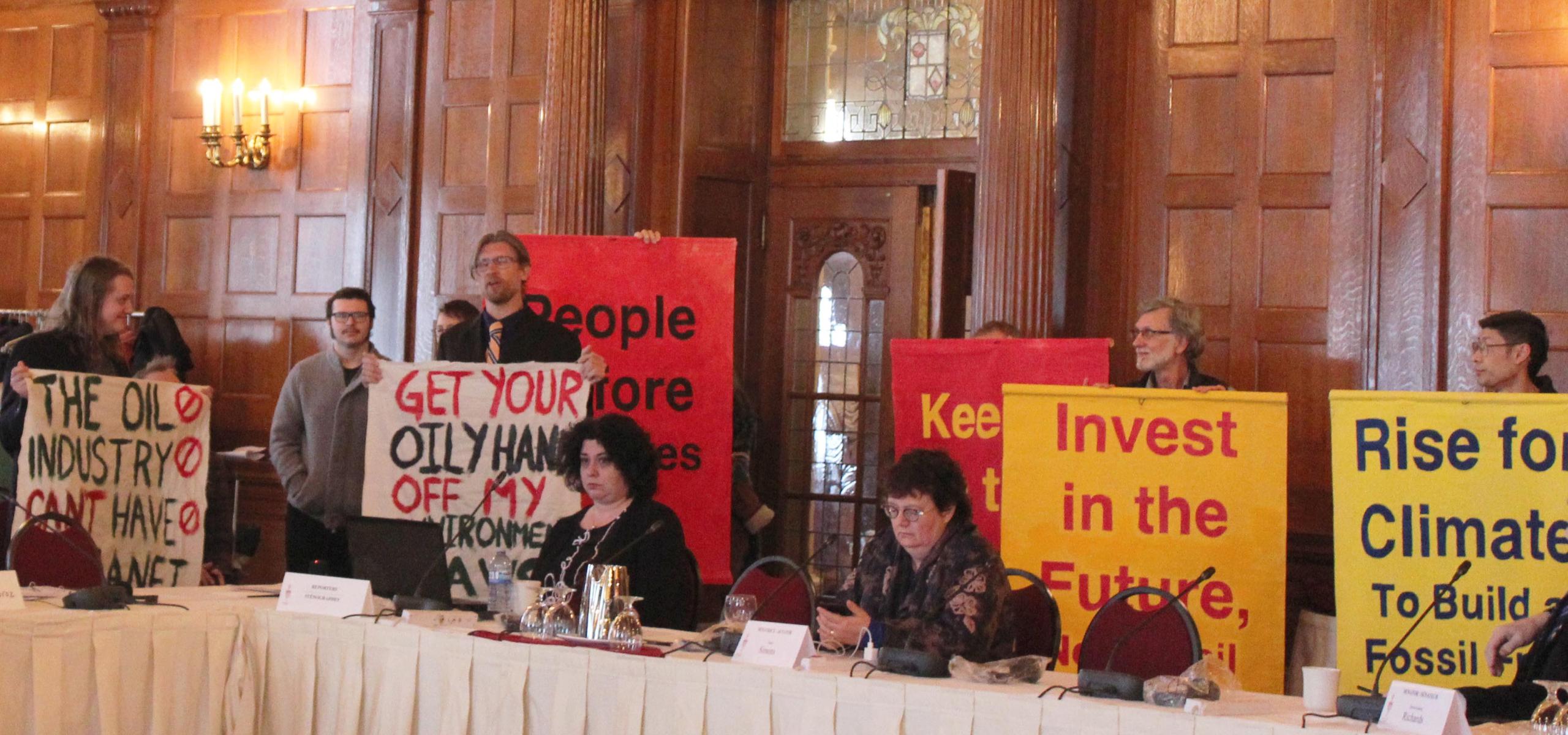 The hearing at the Hotel Fort Garry in Winnipeg Friday morning was disrupted by members of the Wilderness Committee and Concerned Citizens of Manitoba.