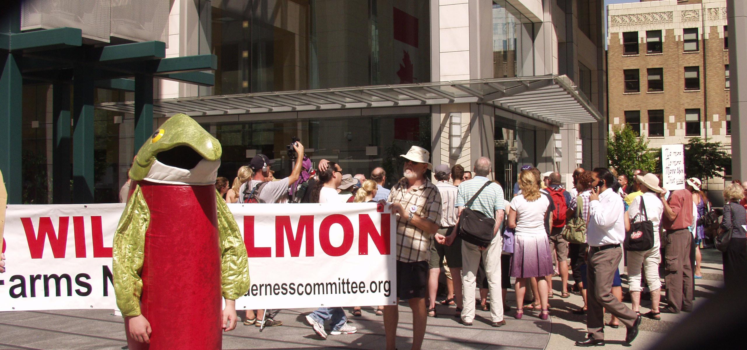 The protest was organized by the Wild Salmon Circle, a new concerned citizen's group and was a great success. They were joined by the Wilderness Committee's new "Tum Tum - Voice of Wild Salmon" mascot, as well as many other people concerned with the health of wild salmon. People are especially concerned of the role sea lice from salmon farms are playing in killing our wild salmon and the lack of action from our governments.