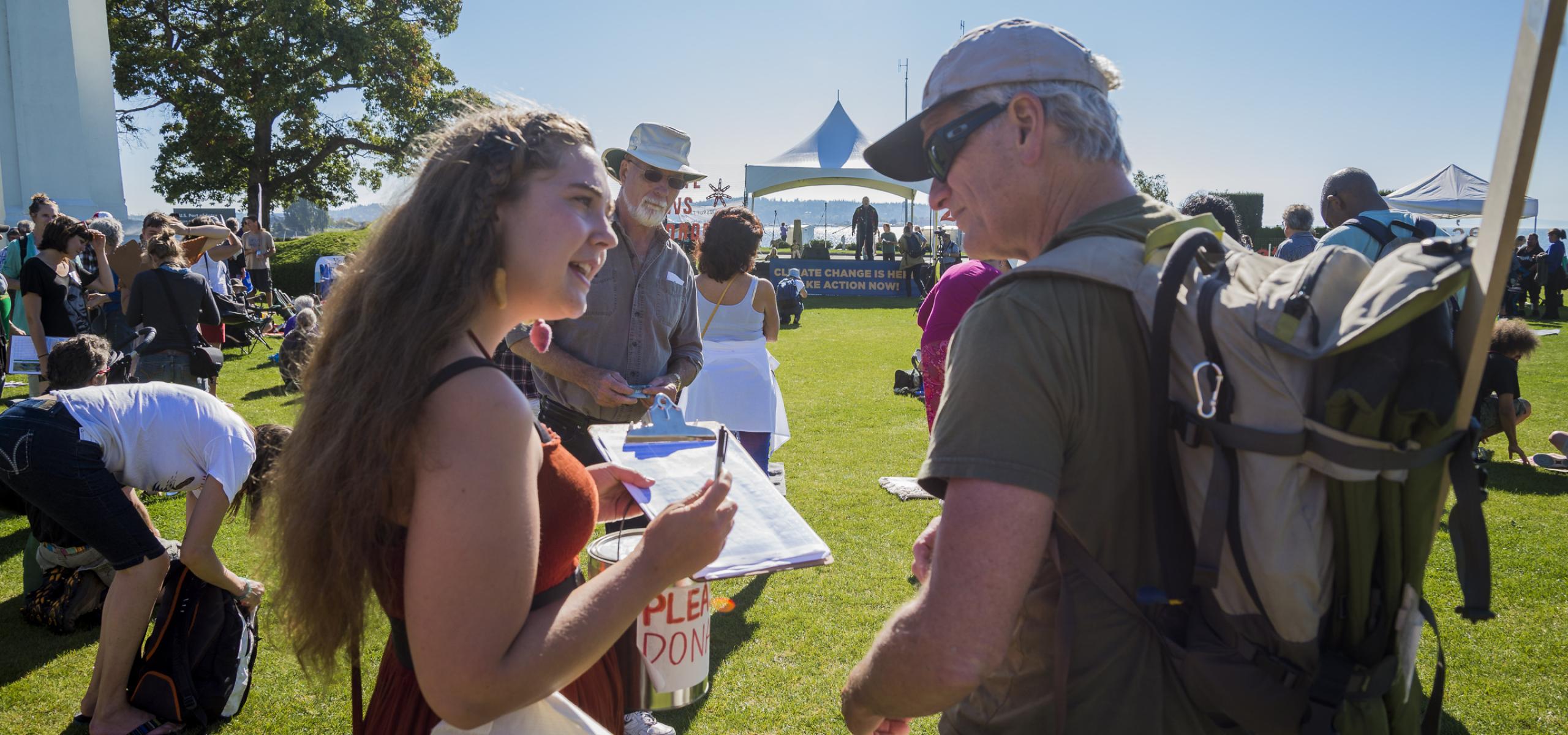 Top photo: Volunteers collected signatures on the Pledge at the Cross-Border Climate Rally at the Peace Arch, Sept. 20, 2014. (Michael Wheatley)