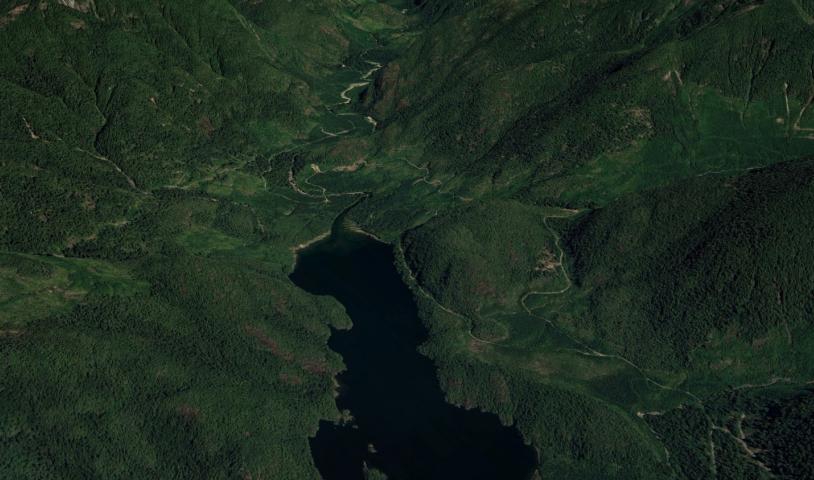 An aerial shot of the Donut Hole, a small valley cut into thick forest and shadowed between two mountain peaks.