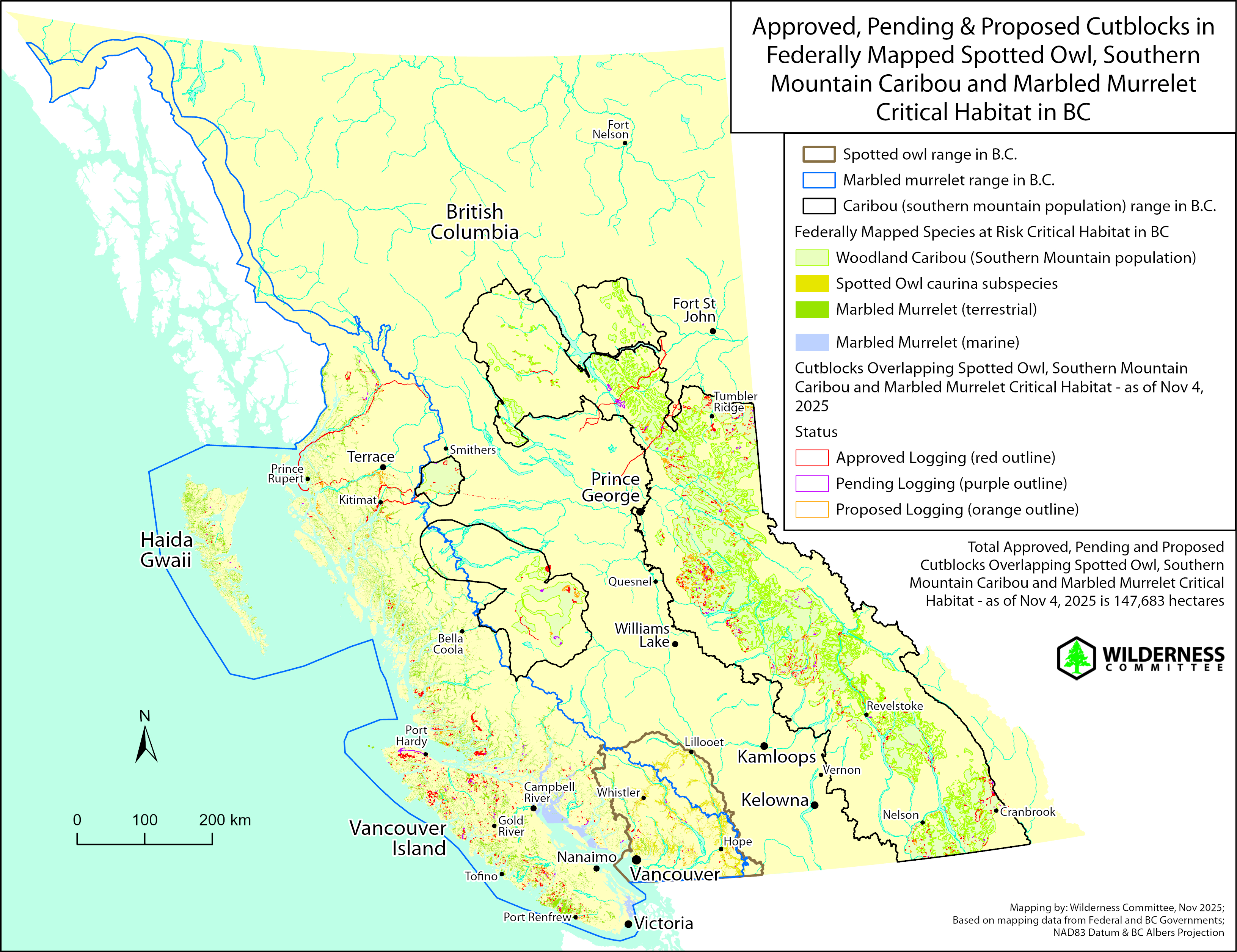 Maps of approved, pending and proposed cutblocks in federally mapped spotted owl, southern mountain caribou and marbled murrelet critical habitat in B.C.