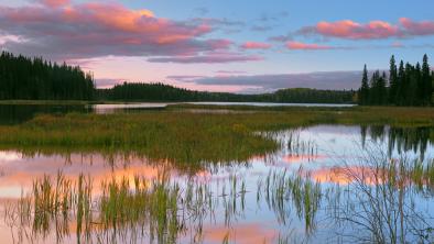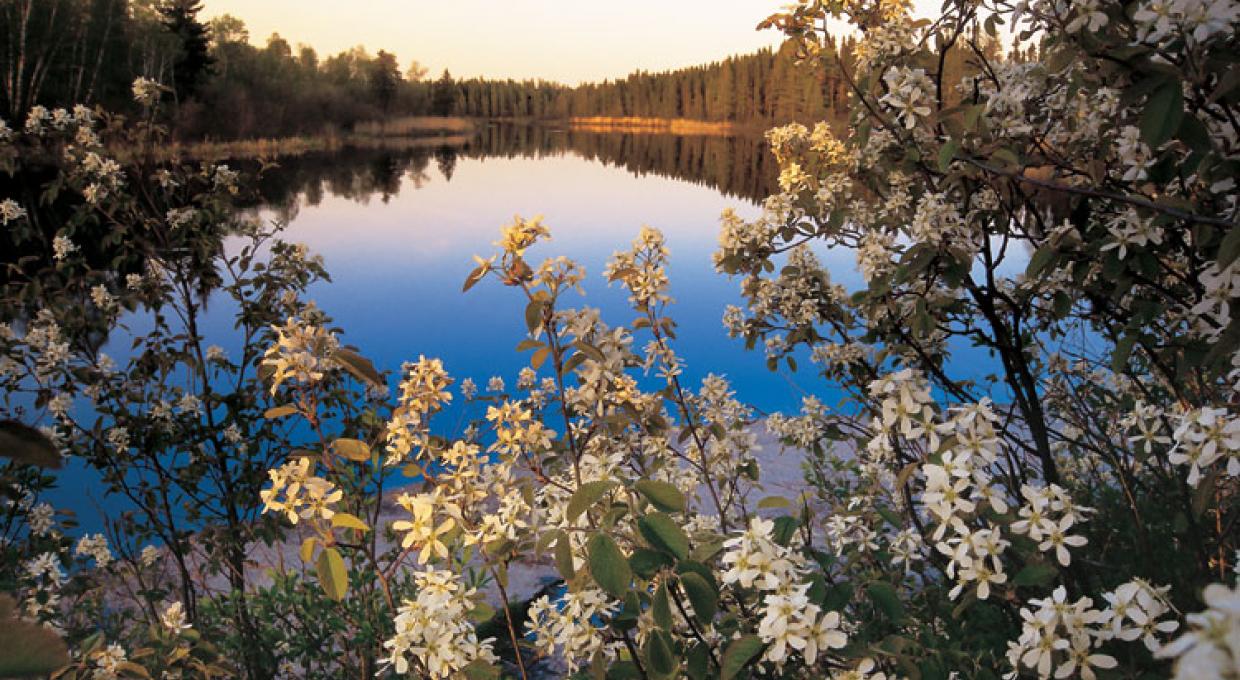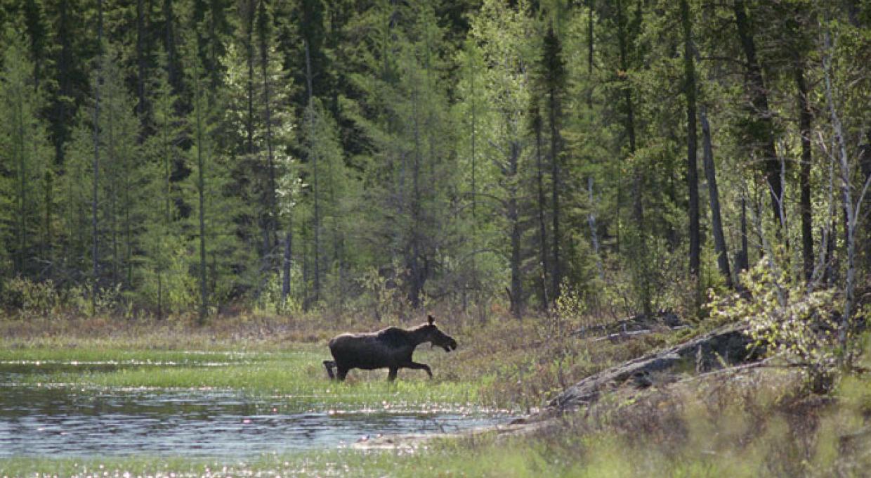 A photo collage of the Duck Mountain region showing photos of the nature and wildlife like eastern wolves, moose, and rusty-blackbirds. in the area