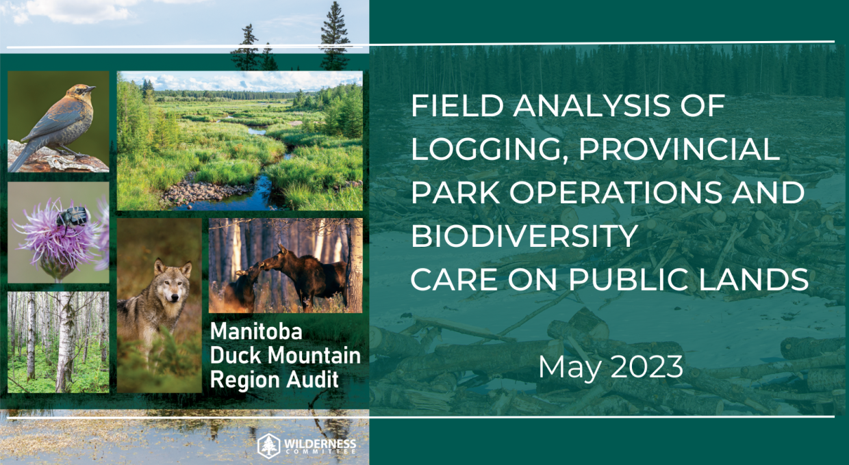The cover of the Manitoba Duck Mountain Region Audit (featured in white text in the middle of the photo). There is a picture of rusty blackbird, a stream, a bumble bee in a purple flower, a forest, a wolf and two moose. The Wilderness Committee logo is on the very bottom. The right side of the image is a clear cut area with white text overlaid that reads "Field analysis of logging, Provcincial Park Operations and biodiversity care on public lands. May 2023"