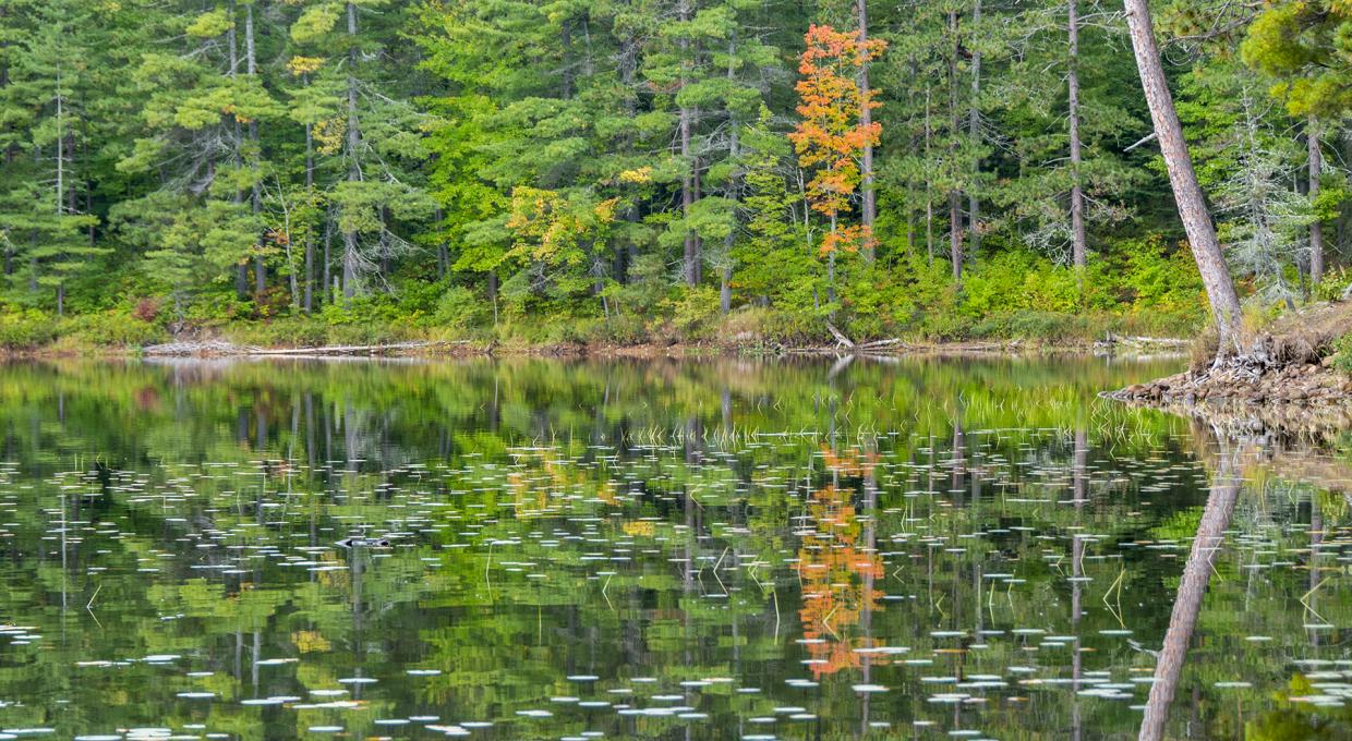 Tall, knotted and moss-covered trees crowd the shore of a river. The leaves are vibrantly colored yellow and red for the fall.