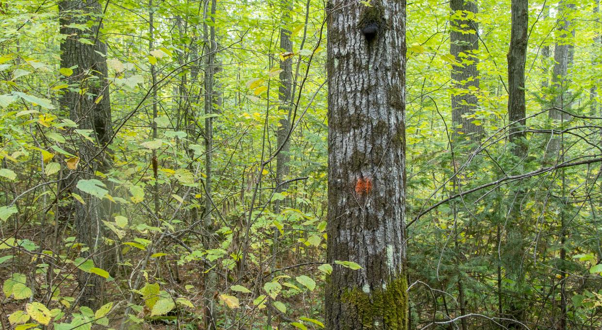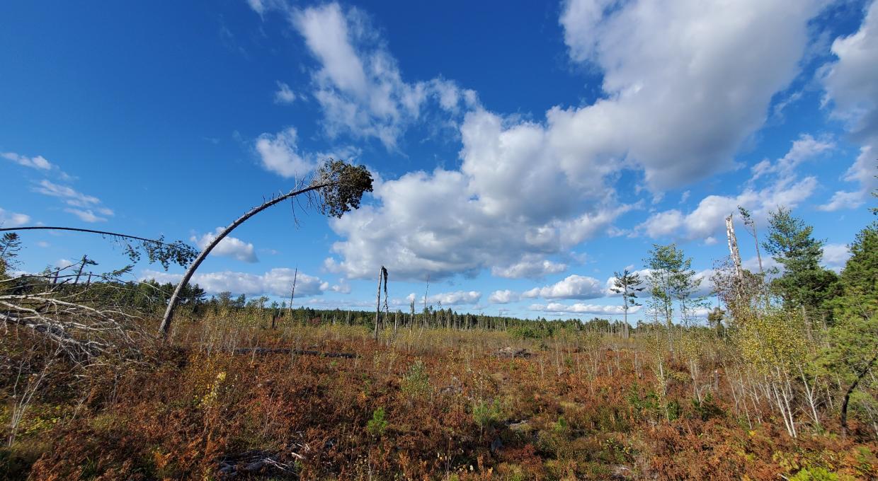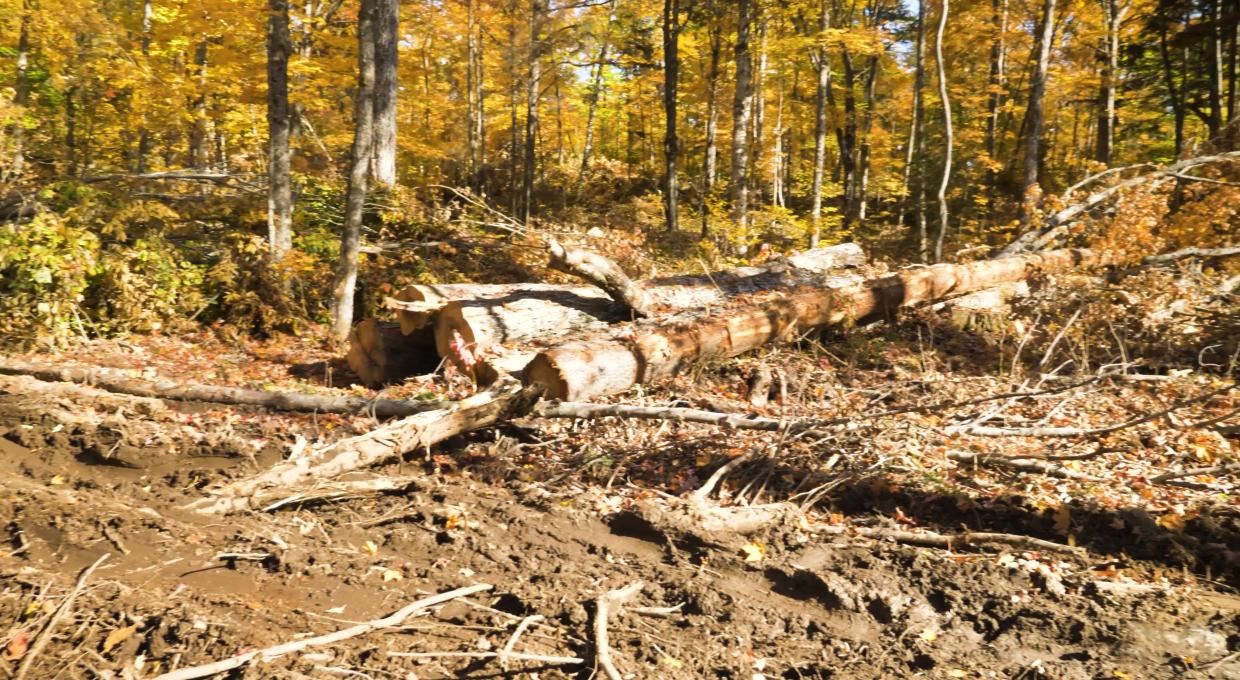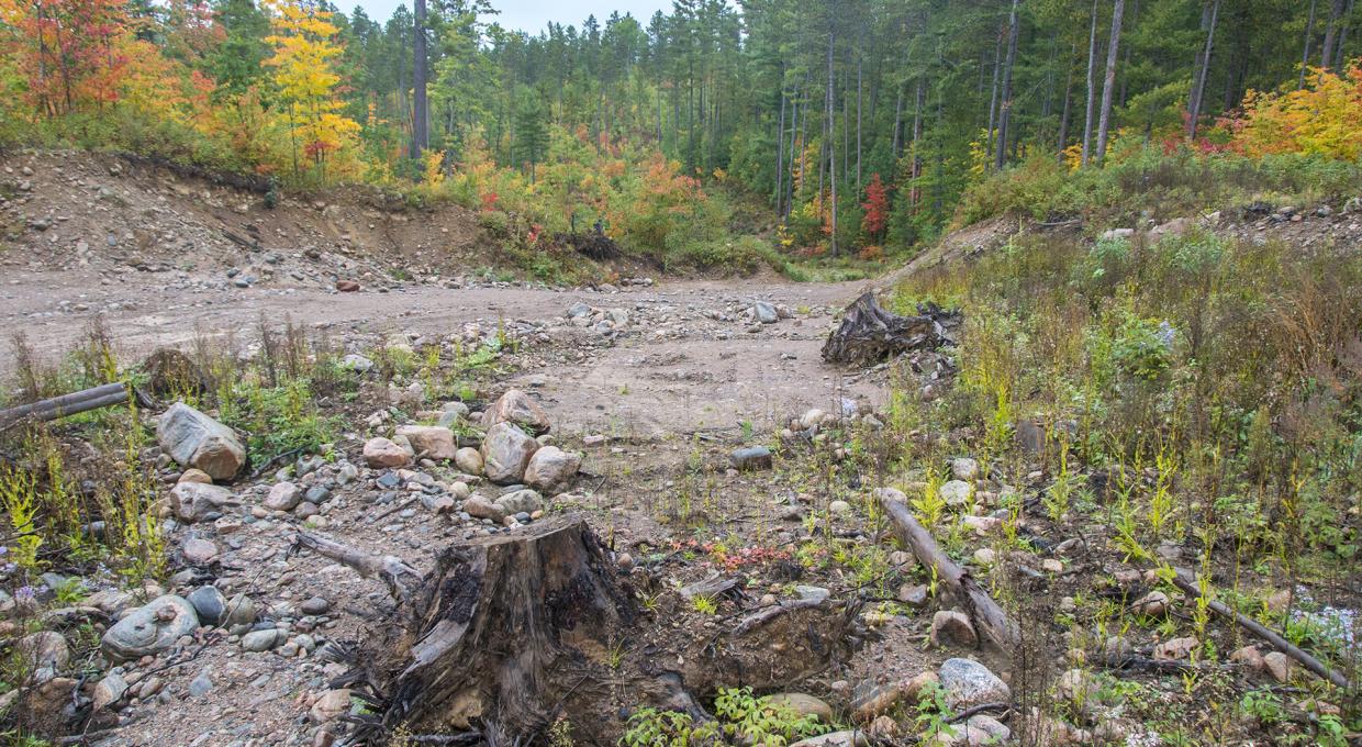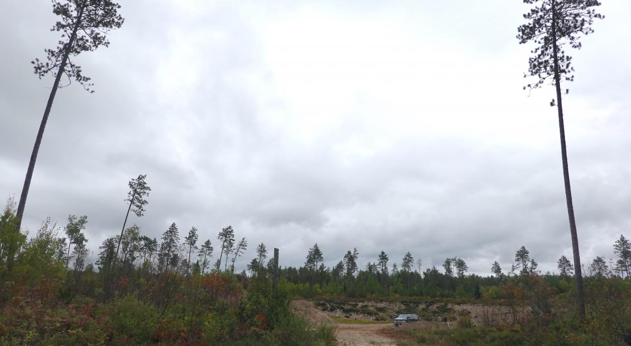 Only two tall trees remain in a logged area on opposite sides of a logging road in Algonquin Park.
