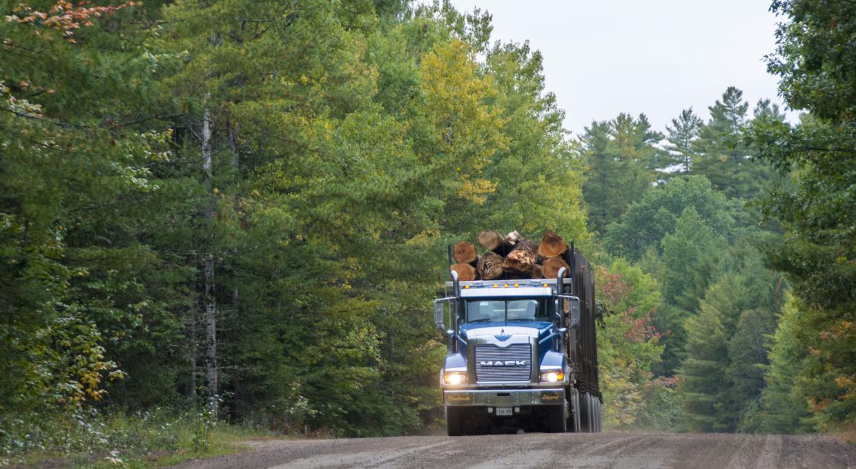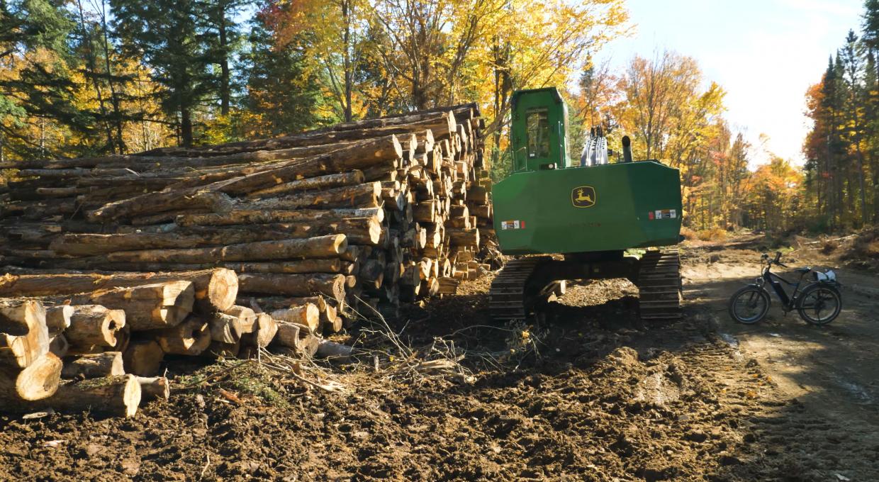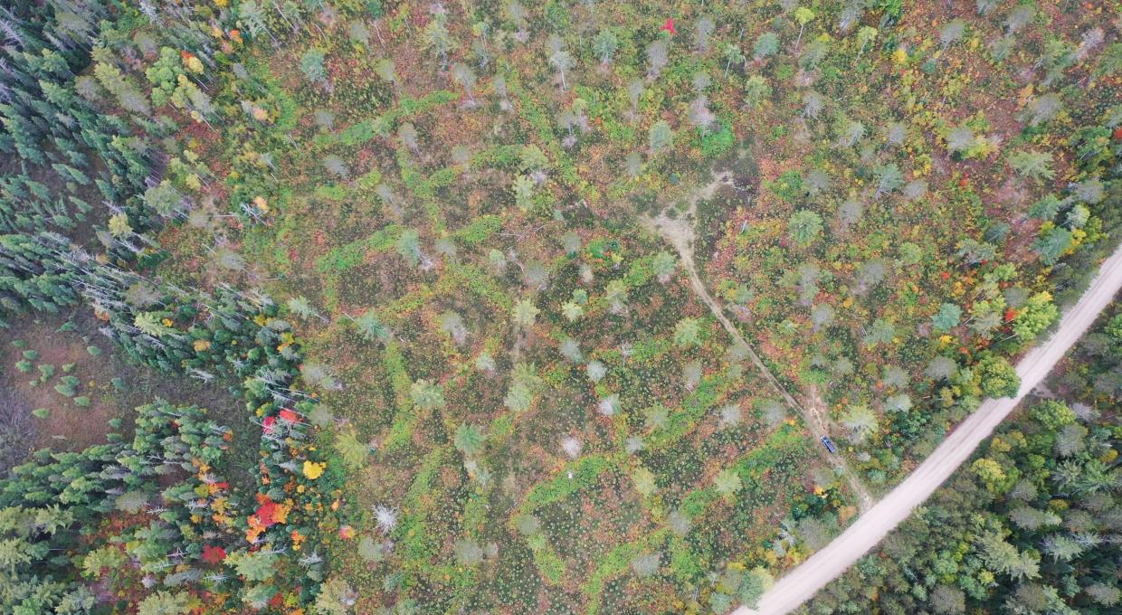 Aerial view of a logging road and a pile of logs with heavy machinery in otherwise intact forest in Algonquin Park.