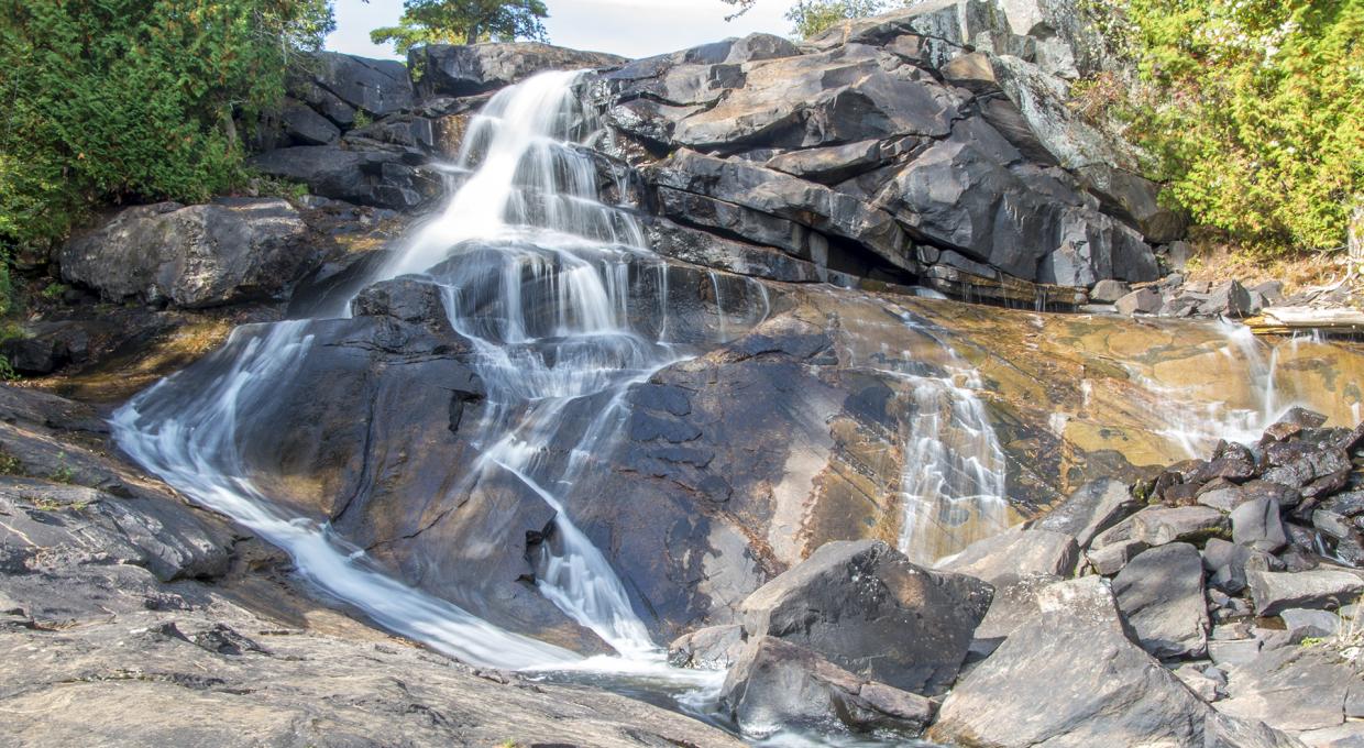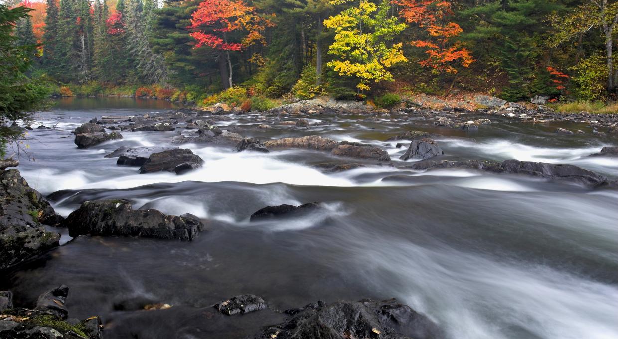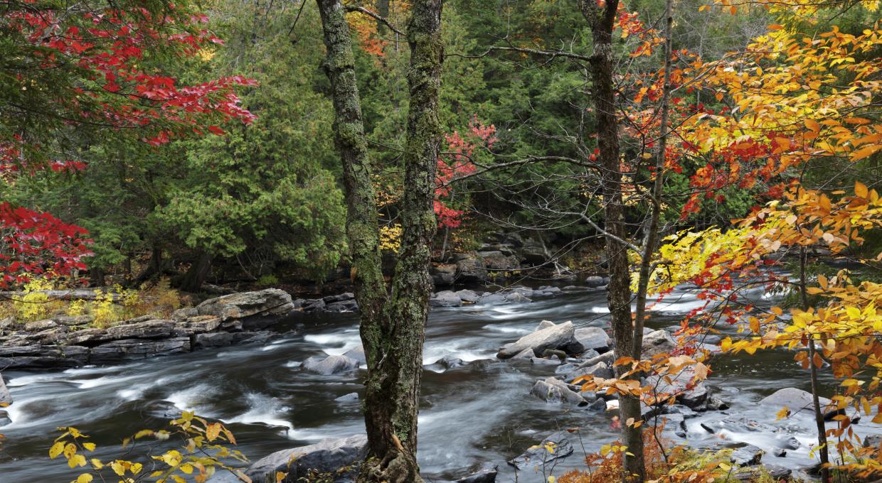 A river flows over slick black stone through a forest that is brightly colored with vibrant reds and yellows.