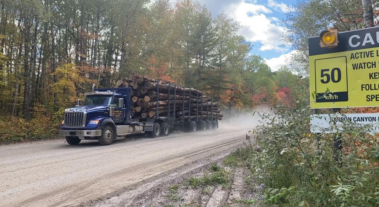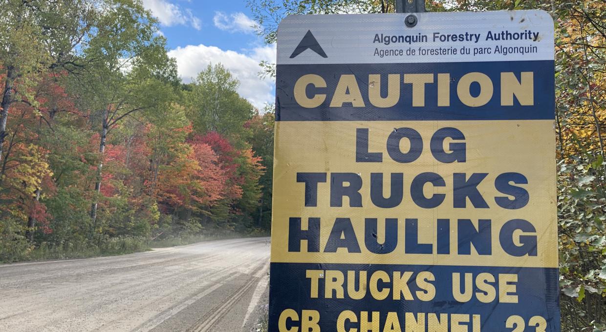 A sign next to a gravel logging road reads "Caution. Log trucks hauling. Trucks use CB Channel 23".
