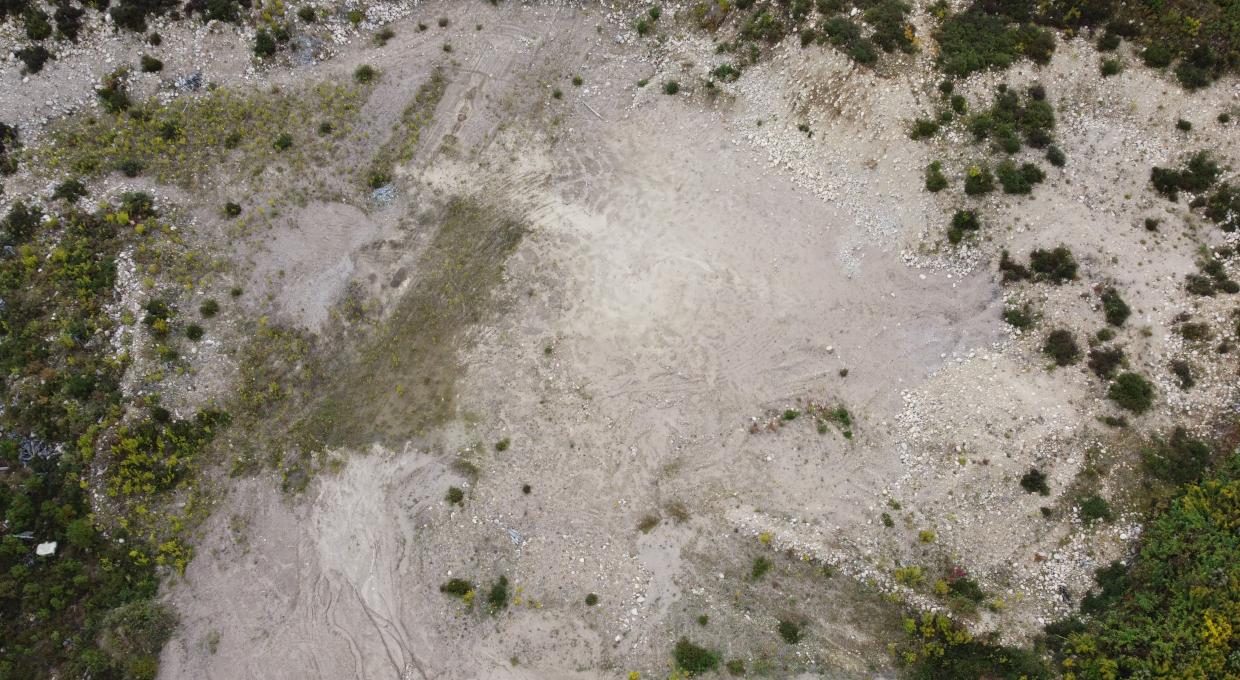 Aerial view of a gravel pit with sparse vegetation at its edges.