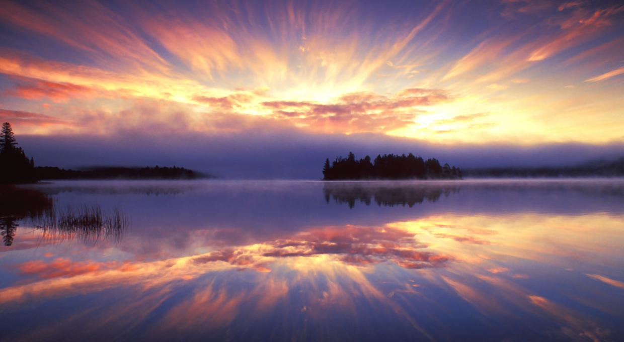 A bright sunburst streaks out from behind pink clouds on a periwinkle sky. Across the lake on a distant shore the forests are silhouetted in black. The water of the lake reflects the sky like a mirror.