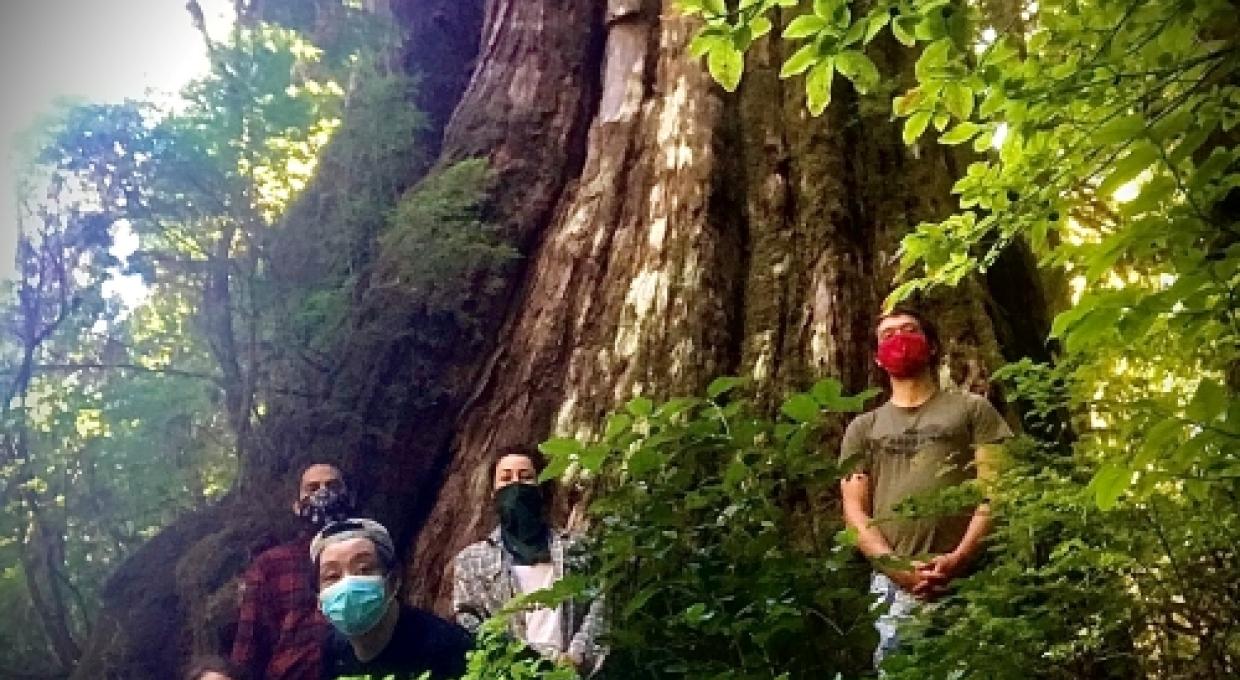 Wilderness Committee trail building crew and big old-growth cedar, Meares Island, Clayoquot Sound