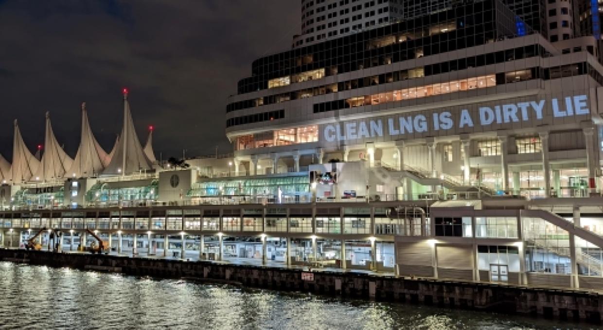 Industrial projector used to send message about the harmful impacts associated with the production, shipment and use of LNG.