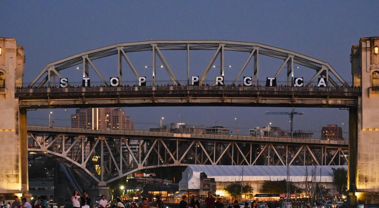 A call to stop PRGTCA in lights shine on a bridge against a dusky summer evening sky