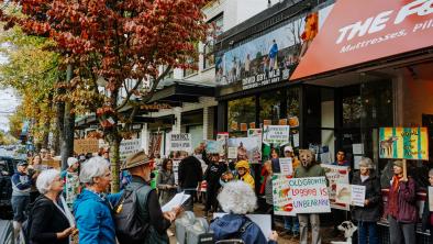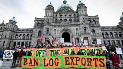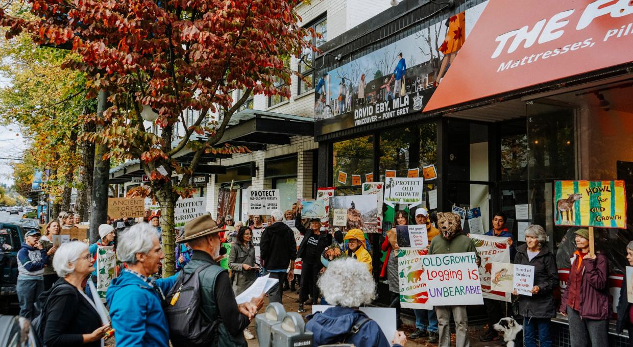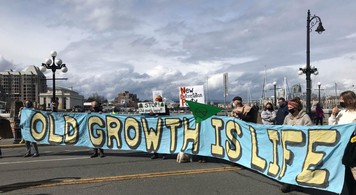 Old-growth protesters in front of banner and signs, Victoria B.C.