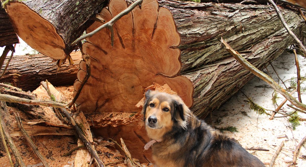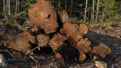 A photo of a worried individual leaning against an old-growth stump. The words "Beautiful British Columbia? Horgan: Protect old-growth." appear over top of the photo.