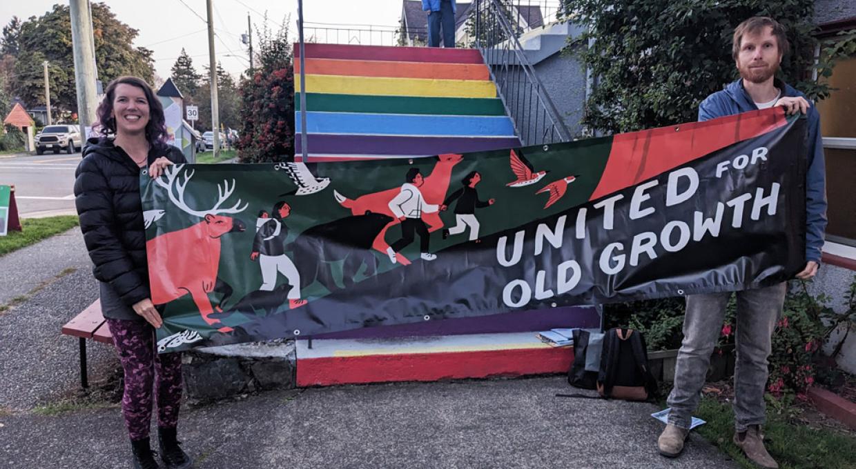 Two people holding a United for Old Growth banner outside an All Candidates Meeting.