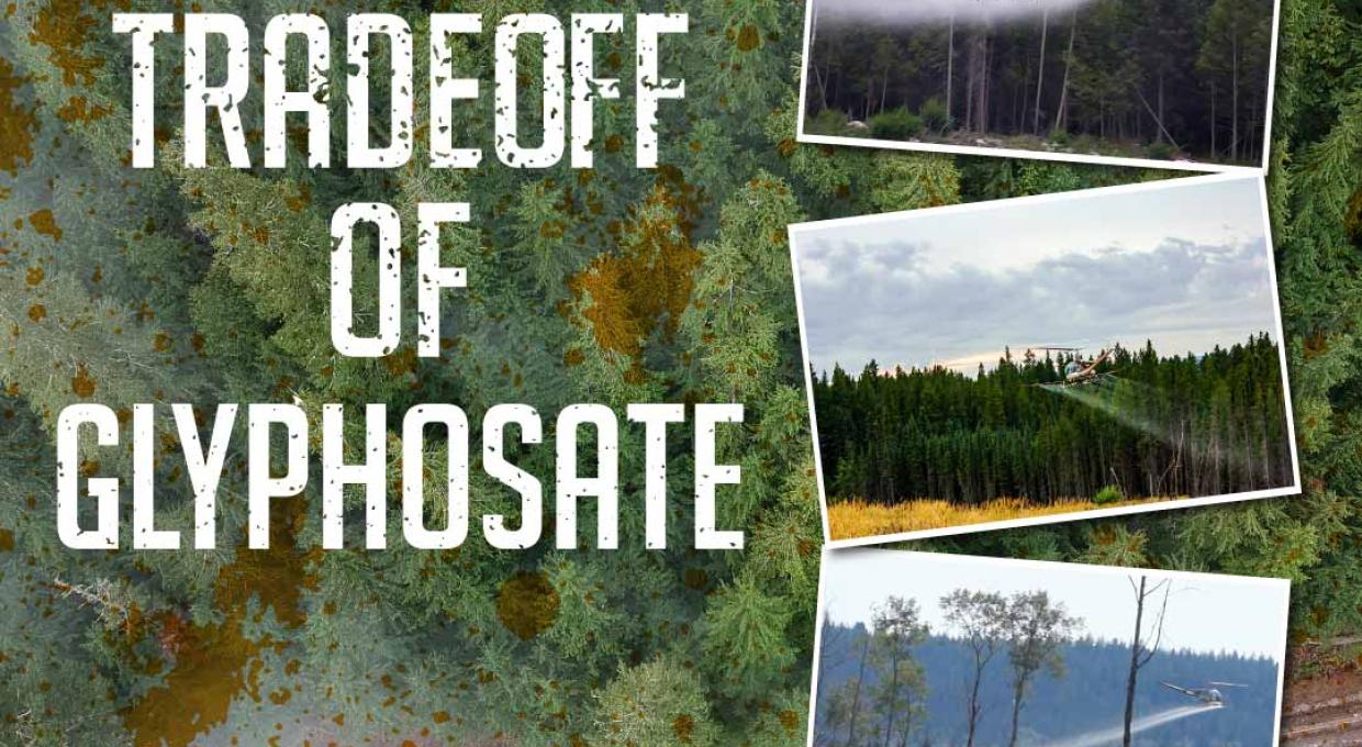 Three photos of helicopters spraying glyphosate from the air over a photo of a logging road