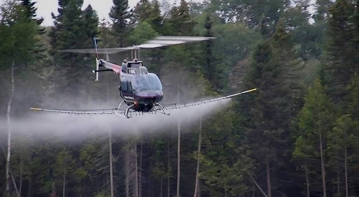 An aerial shot of a helicopter spraying glyphosate in logged areas.
