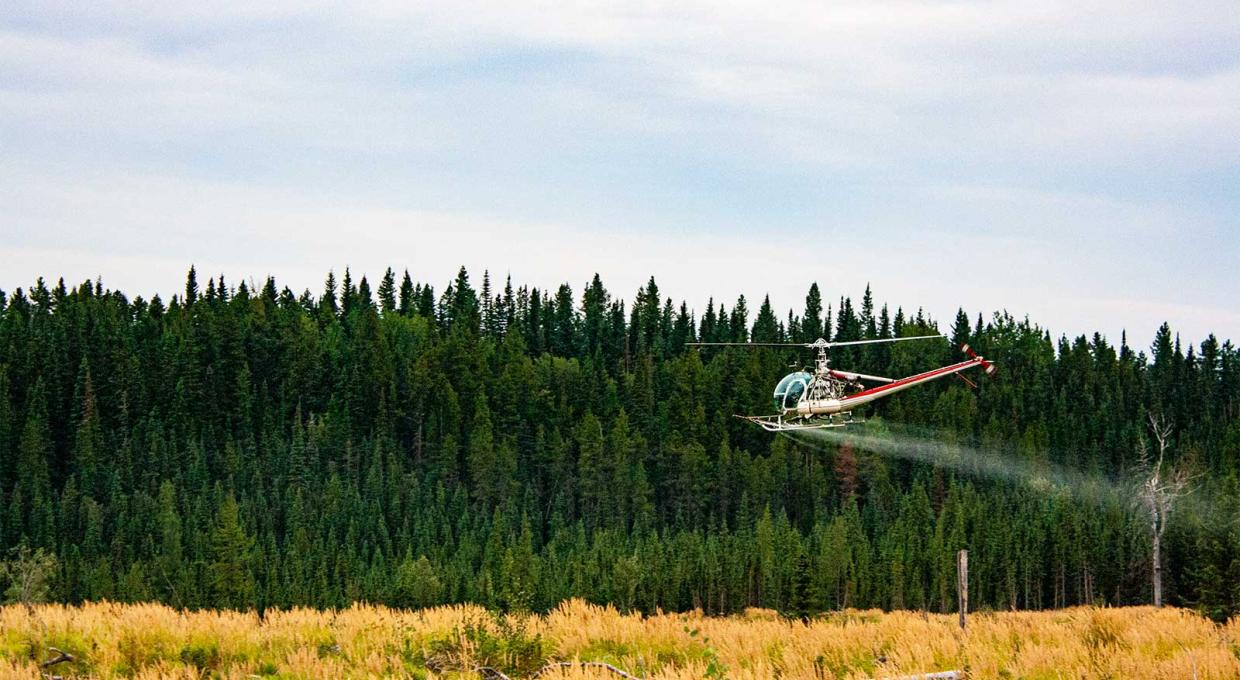 A shot of a helicopter spraying glyphosate over West Fraser cut blocks in Alberta.