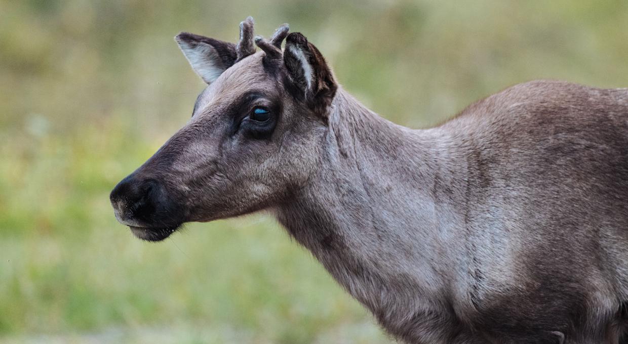 A caribou calf in focus.