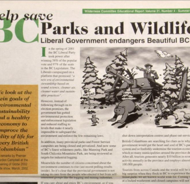 In the spring of 2001 the BC Liberal Party took power after winning 58% of the popular vote and 97% of the seats in the BC Legislature. The Liberals campaigned on a platform that promised "a new era of environmental stewardship based on sound science, cleaner air, cleaner water and sustainable practices." However, instead of following through on its election promises, the government has gutted environmental protection and enforcement legislation and reduced staffing to levels that make it nearly impossible to safeguard the environment and enforce the few remaining laws. This paper takes a close look at the on-the-ground effects of the BC government's environment policies.