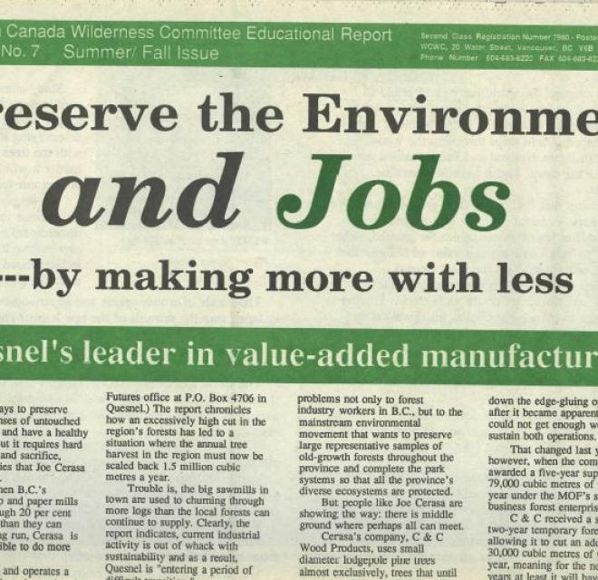 This is a 1991 Wilderness Committee education report that looks at the low rate of job creation in the BC wood-products industry. The report documents cases of people creating many more jobs per cubic meter of wood than the industry average - and discusses ways of increasing job creation industry wide. The report also warns about the impacts on jobs and environment of continuing to log at too high rates in a futile effort to mitigate the low rate of job creation.
