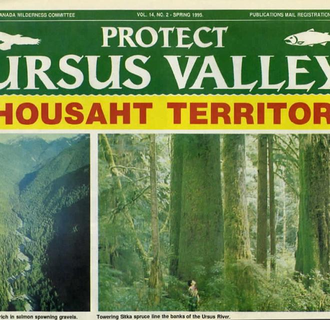 This is a 1995 Wilderness Committee education report about the Ursus Valley. Located right in the geographic heart of Clayoquot Sound is the 6,567 hectare Ursus, a never-clearcut watershed, blanketed in towering moss-hung old growth trees and rich in wildlife and salmon. This still-wild valley is part of Ahousaht First Nation's Territory. A plan by MacMillan Bloedel to build a logging road along the Ursus' narrow valley bottom accelerated efforts to protect this special valley. The road plans were eventually dropped and the Ursus remains roadless to this day. Efforts continue to see the Ursus permenantly put off-limits to logging.